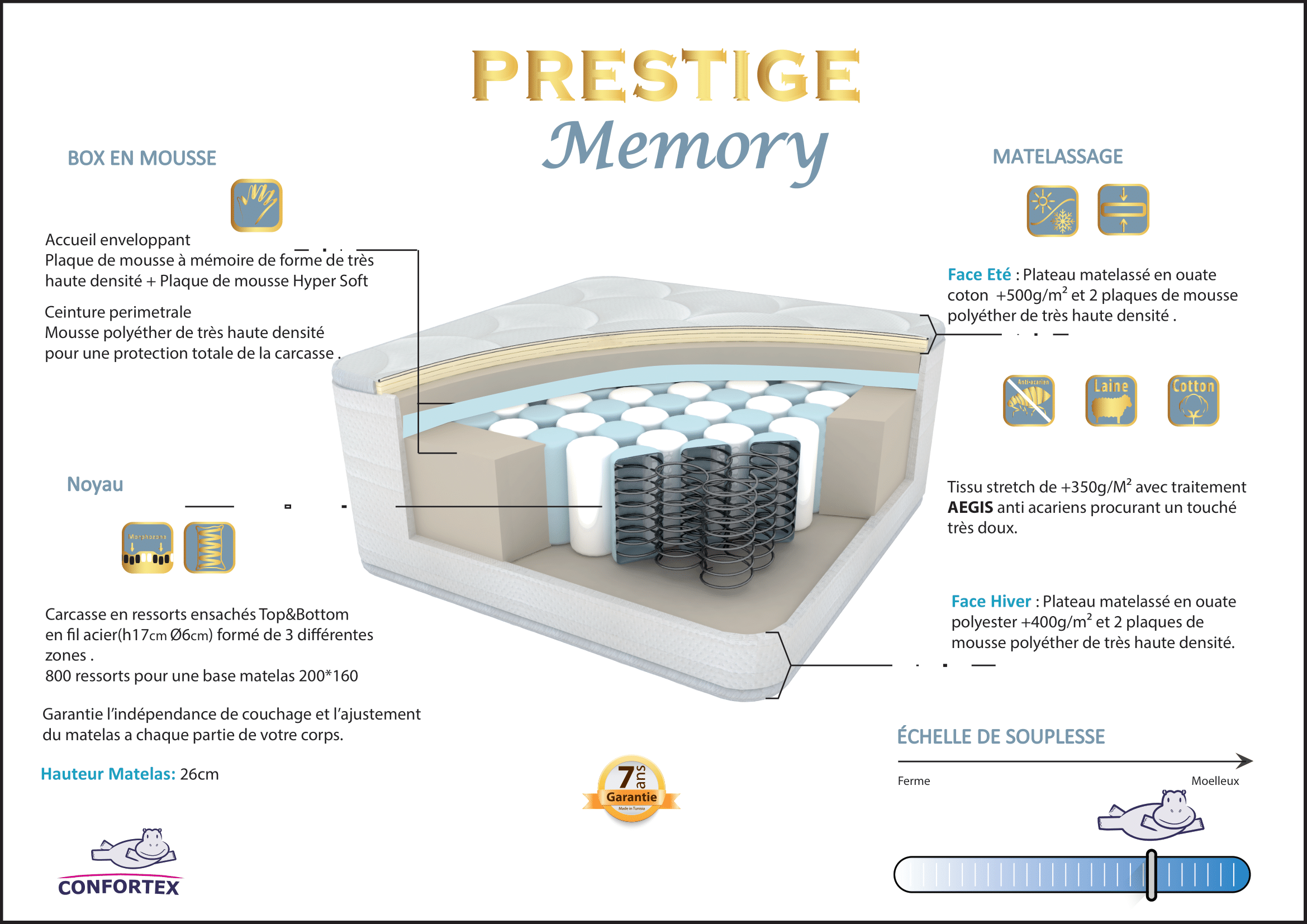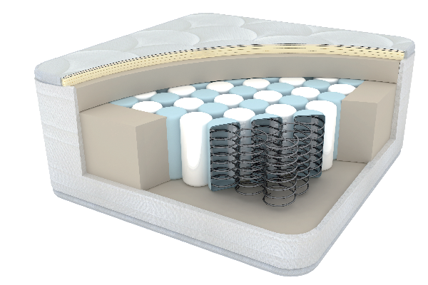 - Carcasse en ressorts ensachés Top & Bottom en fil acier(h17cm Ø6cm) formé de 3 différentes zones .